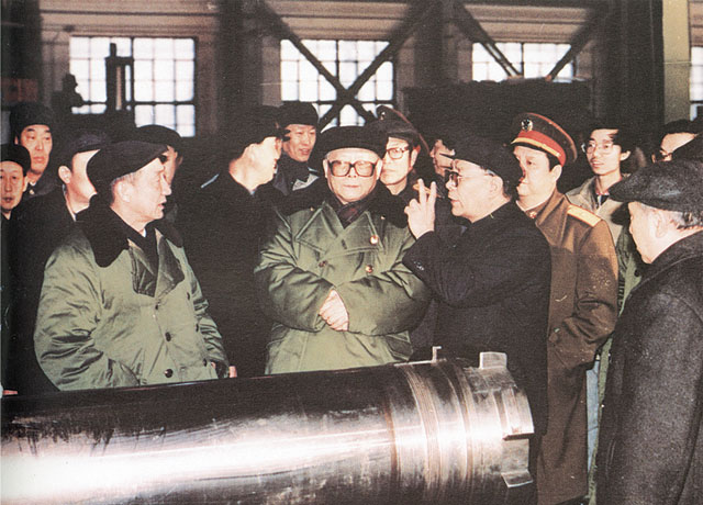 1990年2月17日中共中央總書記江澤民視察127廠時(shí)在車間聽取匯報(bào)