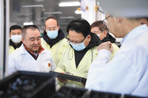 圖為景俊海等在東北工業(yè)集團(tuán)生產(chǎn)現(xiàn)場(chǎng)調(diào)研