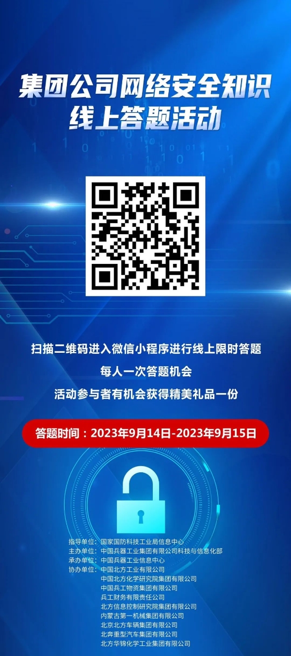 9月11日至17日,中國兵器工業(yè)集團(tuán)有限公司以“數(shù)字創(chuàng)新 智御未來”為主題,圍繞集團(tuán)公司“1+5”戰(zhàn)略和“雙十”規(guī)劃,組織開展集團(tuán)公司網(wǎng)絡(luò)安全宣傳周系列活動。 9月11日,集團(tuán)公司科技與信息化部組織在京單位召開網(wǎng)絡(luò)安全宣講與經(jīng)驗(yàn)交流活動,邀請公安部第一研究所網(wǎng)絡(luò)安全專家針對網(wǎng)絡(luò)安全形勢和個(gè)人防護(hù)技能以及網(wǎng)絡(luò)安全等級保護(hù)主要工作環(huán)節(jié)和標(biāo)準(zhǔn)應(yīng)用作專題講座,會上北方公司、物資集團(tuán)、財(cái)務(wù)公司、北方車輛集團(tuán)、北奔重汽進(jìn)行了工作經(jīng)驗(yàn)分享。